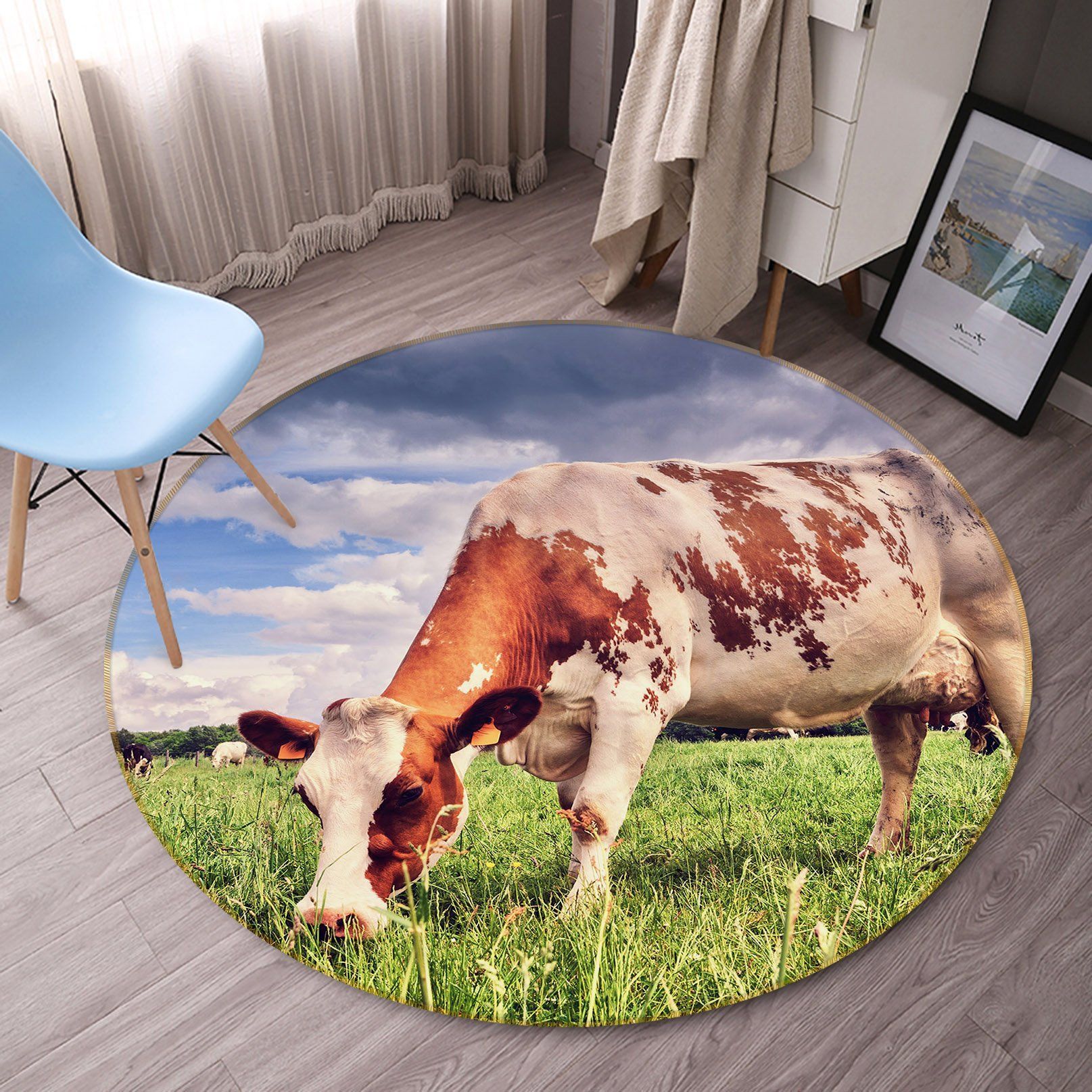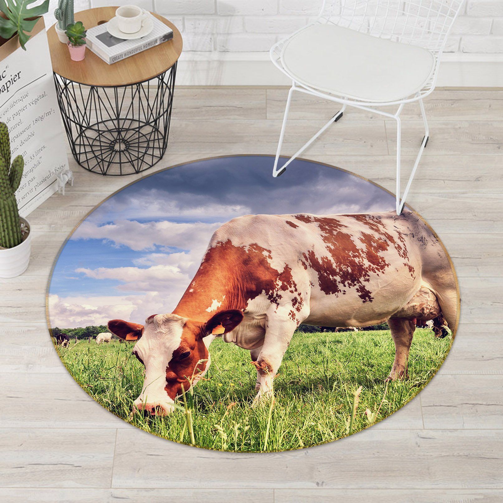Blue Sky Cow Eating Grass Round Rug – Round Carpet Home Decor
