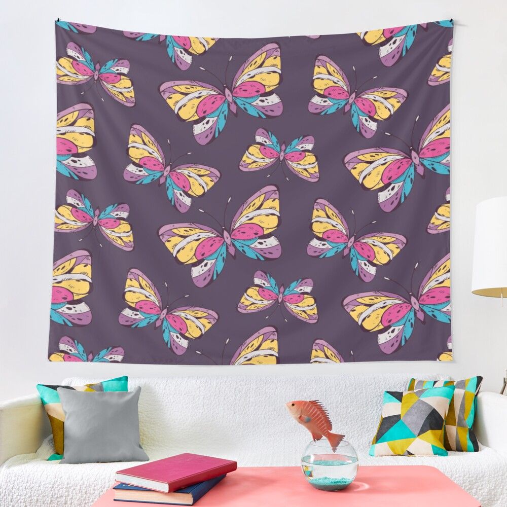 Cute Pink Blue Colorful Butterfly Black Wall Tapestry For Bedroom Teen Girl Living Room Dorm Home Decor