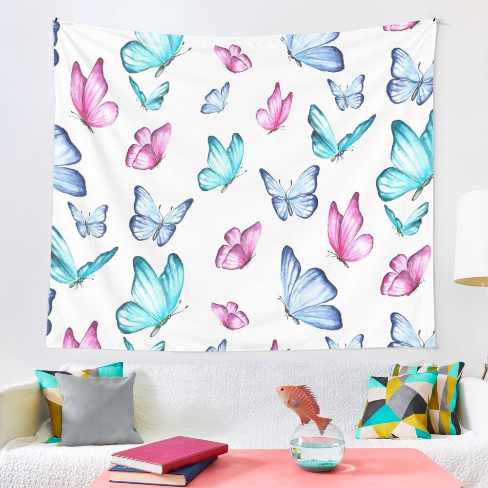 Cute Pink Blue Colorful Butterfly White Wall Tapestry For Bedroom Teen Girl Living Room Dorm Home Decor