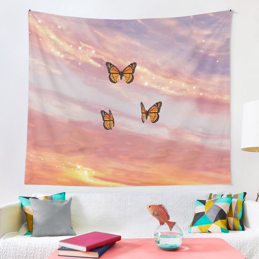 Landscape Sunset Cute Blink Orange Black Butterfly Wall Tapestry For Bedroom Teen Girl Living Room Dorm Home Decor