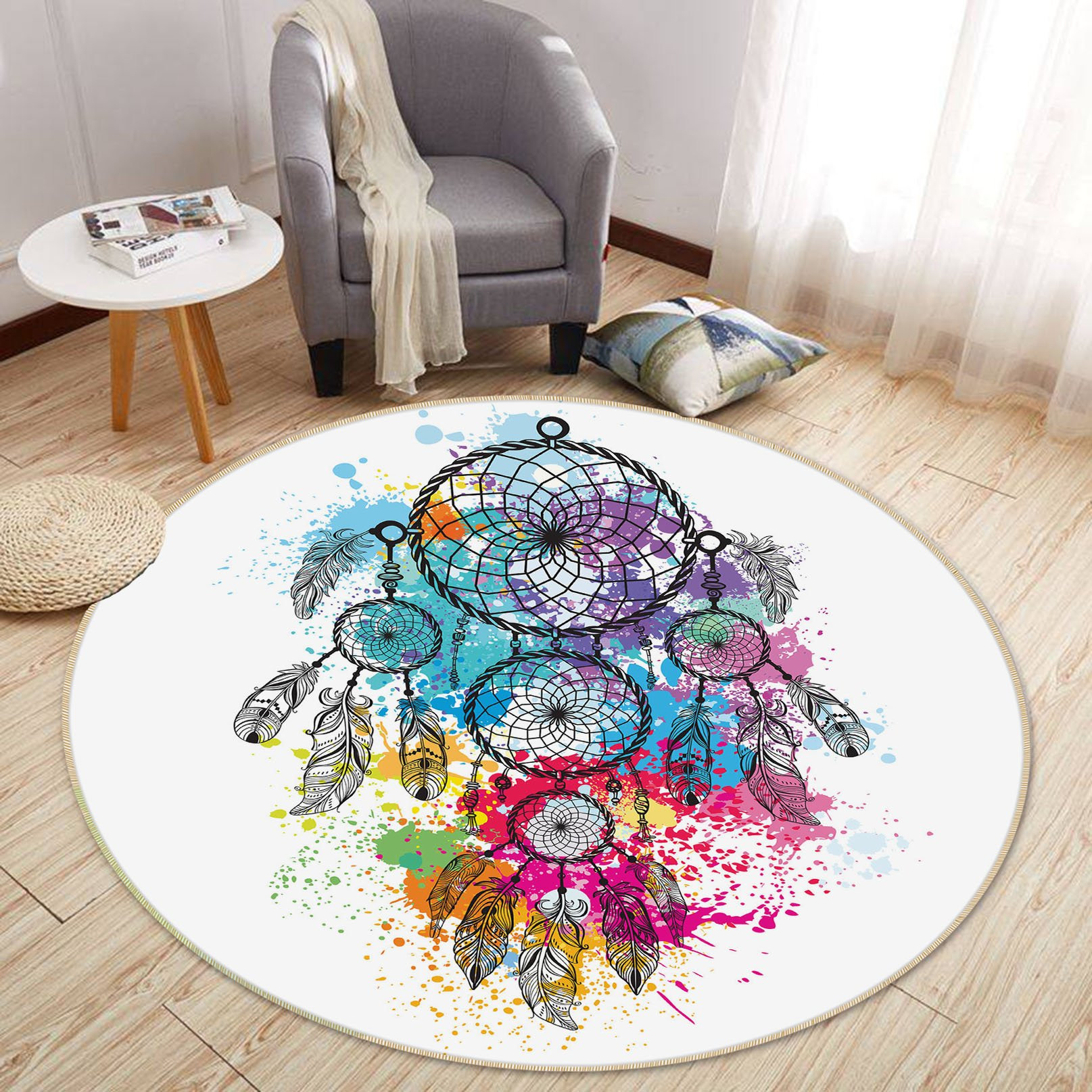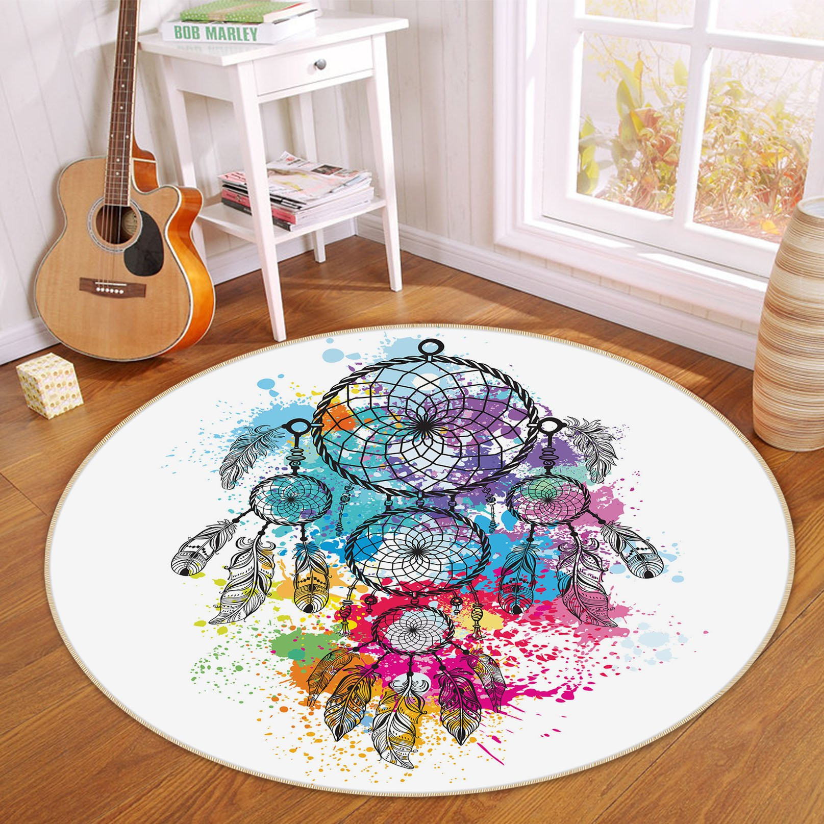 Multicolored Splashing On White With Dreamcatcher Round Rug – Round Carpet Home Decor