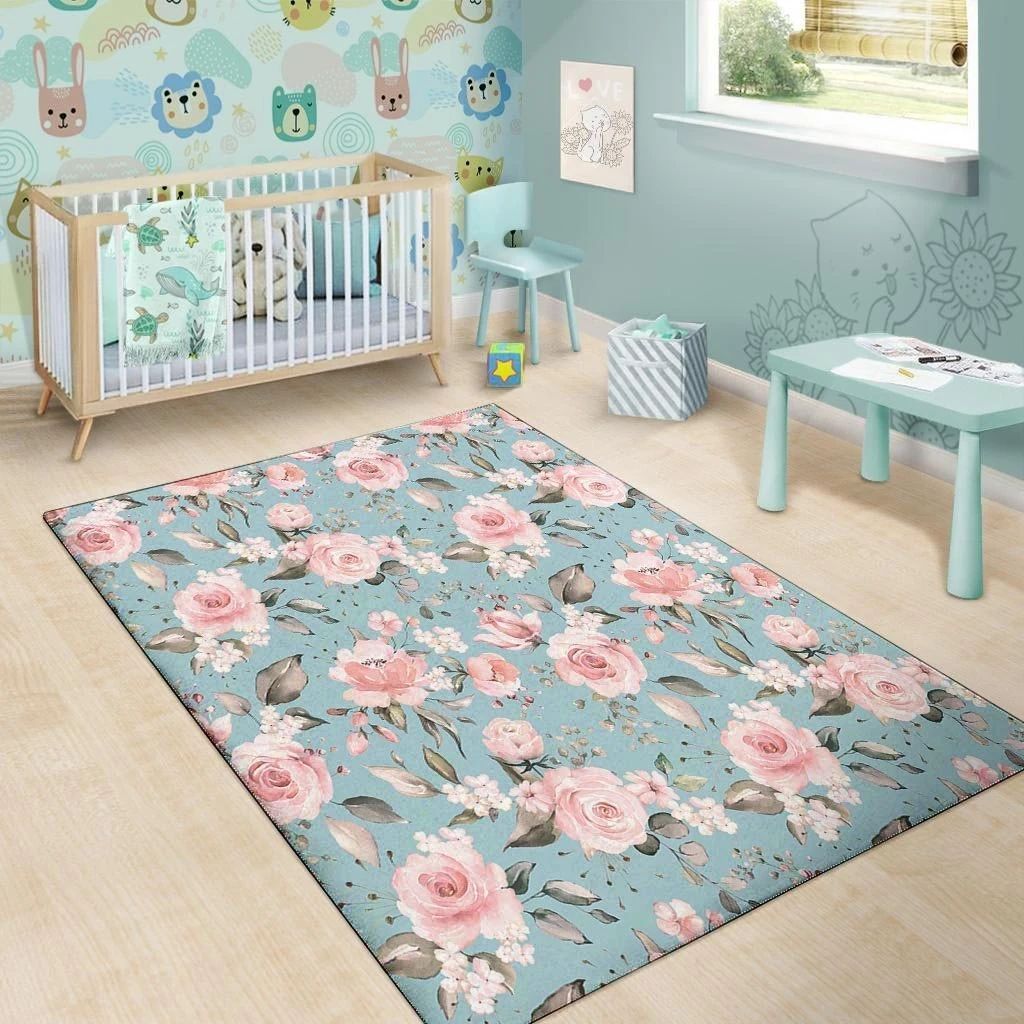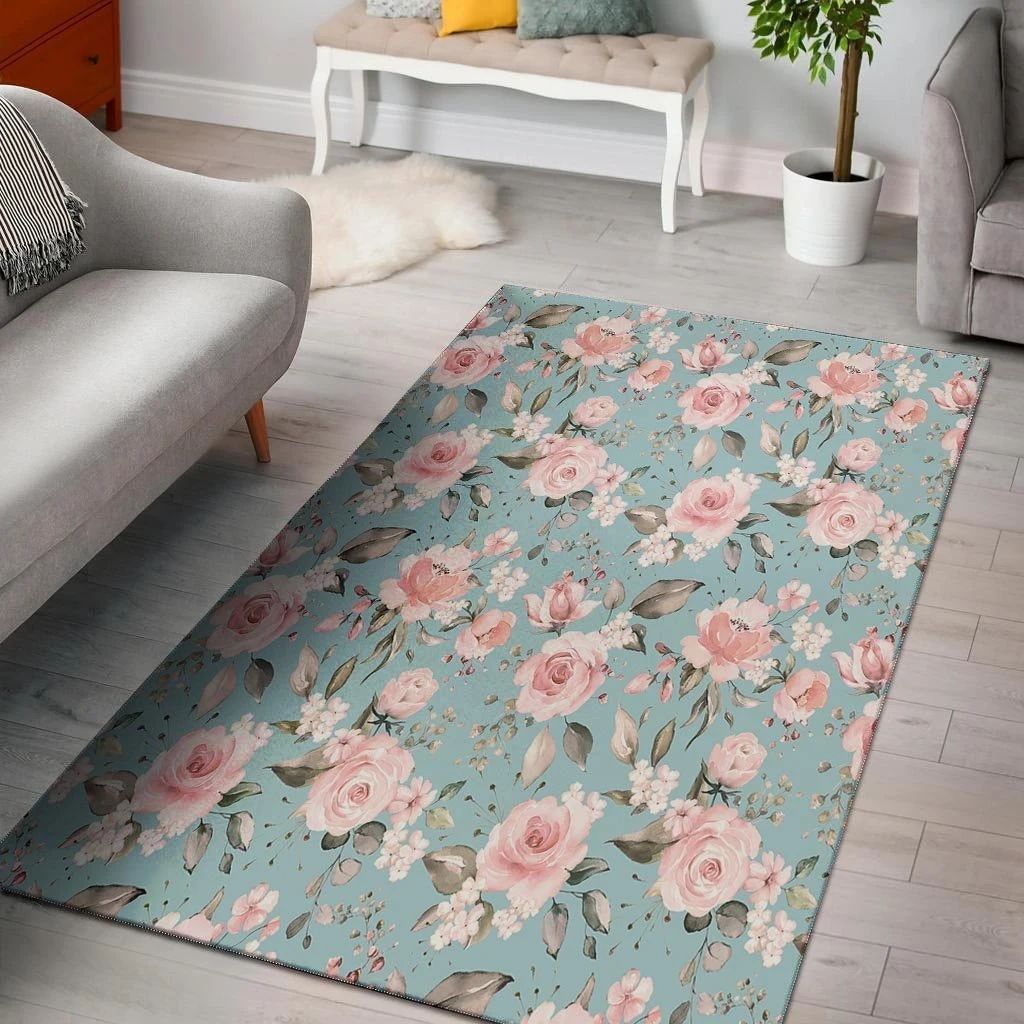 Pale Mint Background With Pink Roses Area Rug Home Decor