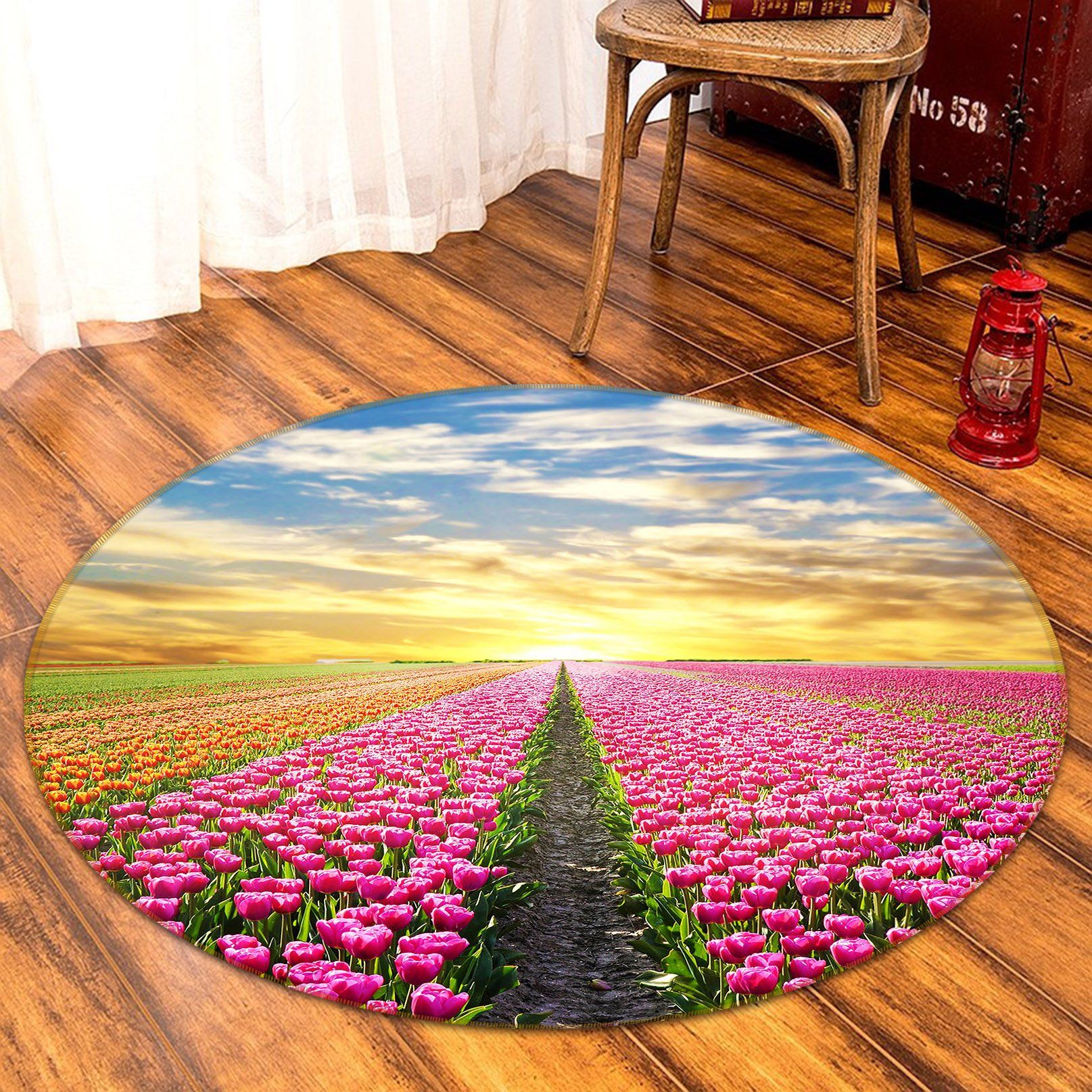Pink And Yellow Tulips At The Sunset Round Rug Home Decor